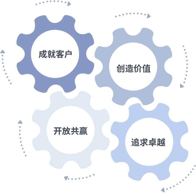成就客户是一切决策的出发点,,,创造价值是衡量所有工作的标准,,追求卓越是我们做事做人的态度,,,开放共赢是我们的格局也是最终的结果。。价值观的齿轮环环相扣,,推动着组织里的每个人不断向前。。。